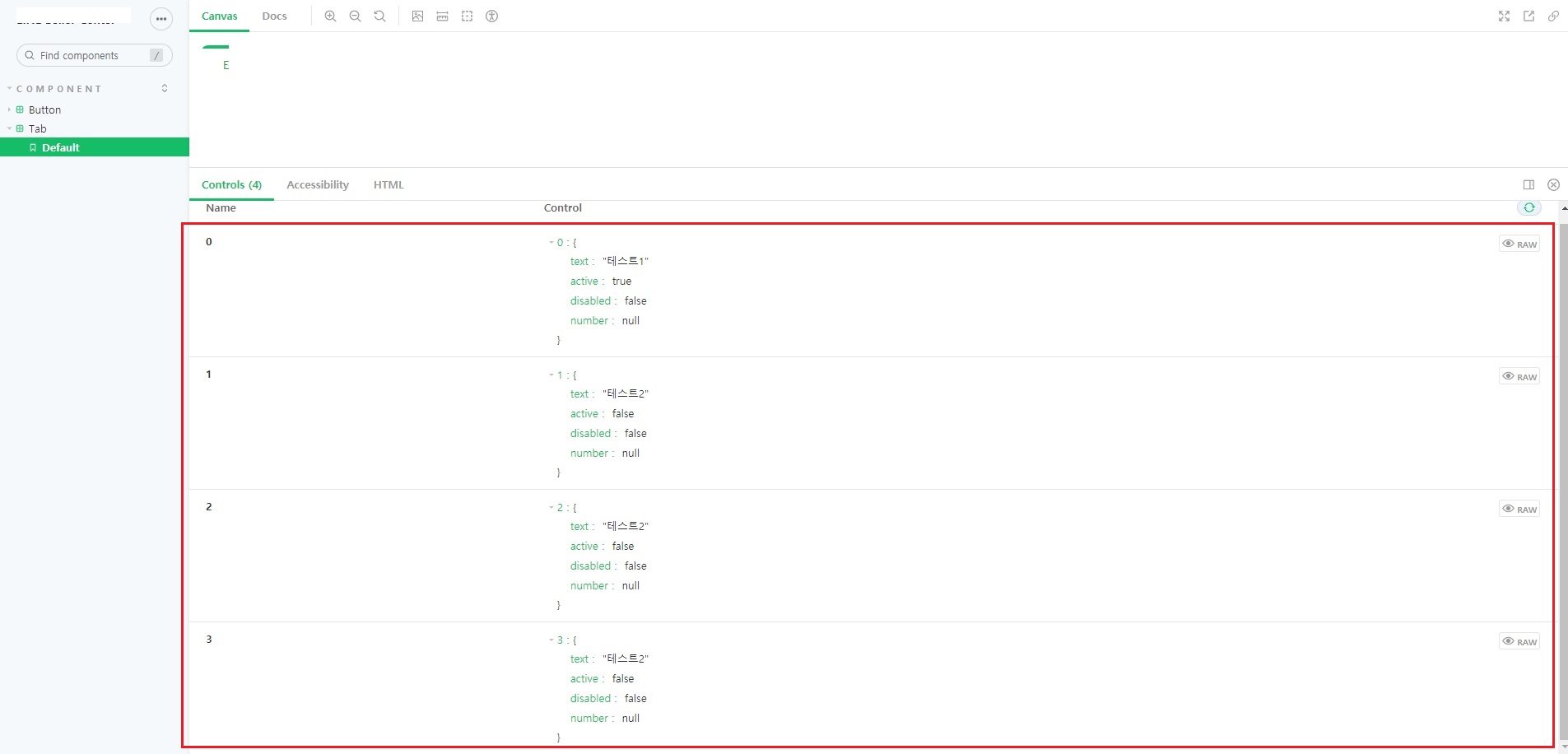 Ps. + 스토리북의 controls 기능도 아래 tab 컴포넌트에선 일단 뺐다. controls는 옵션들 다 빼고 아주 기본적인 상태로만 나오도록했다.