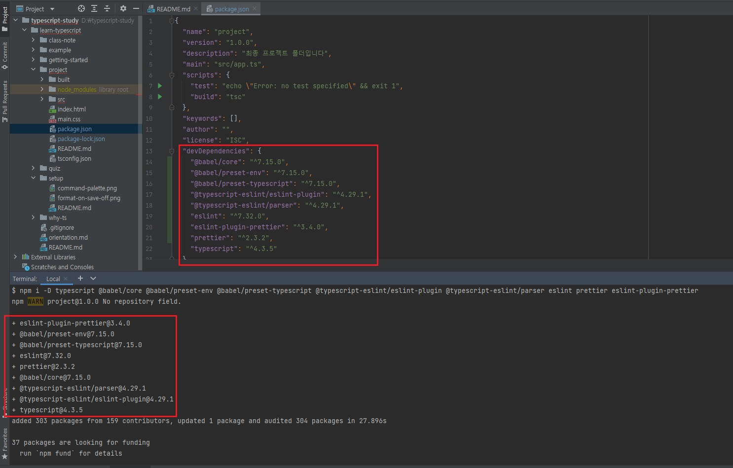 npm i -D typescript @babel/core @babel/preset-env @babel/preset-typescript @typescript-eslint/eslint-plugin @typescript-eslint/parser eslint prettier eslint-plugin-prettierNote-D(= --seve-dev)devDependencies로 정리가 되게하는 플래그이다.- 바벨이란? 최신 자바스크립트 문법을 오래된 브라우저에서도 호환 가능한 자바스크립트로 변환해주는 도구이다. (컴파일 or 트랜스파일)