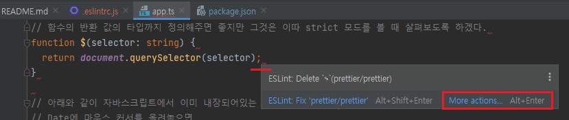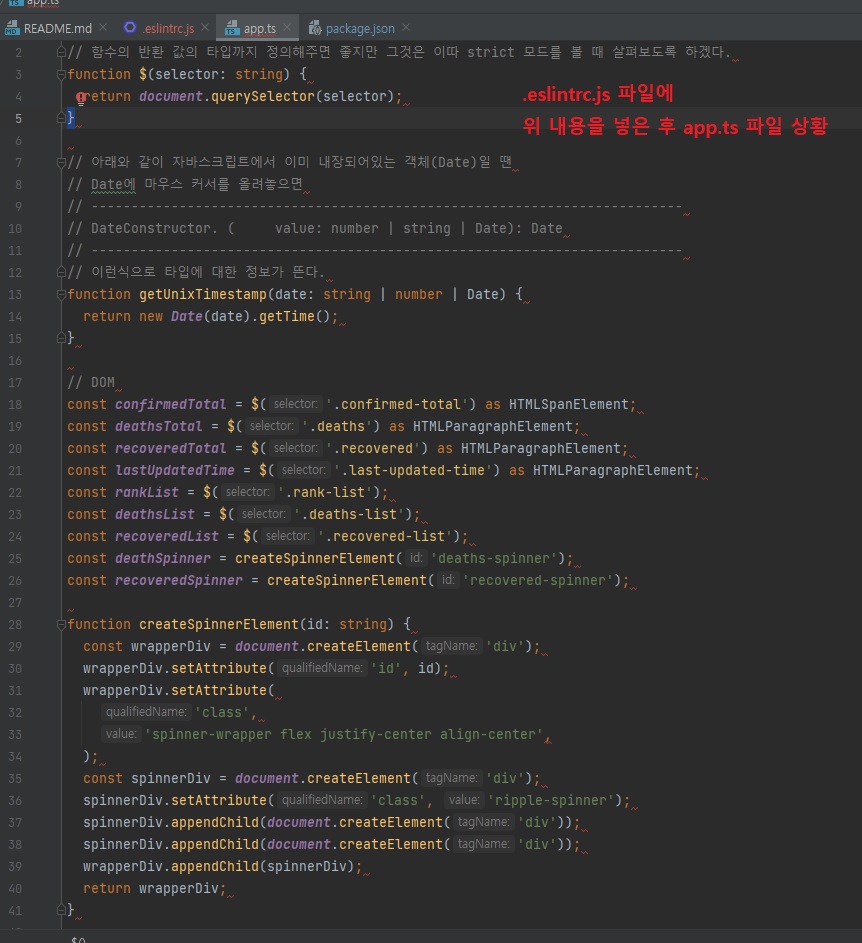@babel/core와 바벨에서 권고하고있는@babel/preset-env,@babel/preset-typescript(타입스크립트용) 라이브러리들도 설치했다. - ESLint란? 자바스크립트 코드를 에러가 덜 나는 방향으로 작성하도록 도와주는 문법 보조 도구
