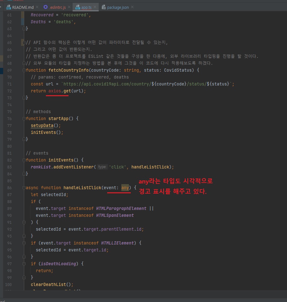 앞시간까지 명시적인 any 선언하기를 위해 tsconfig.json 파일에 noImplicitAny: true를 추가하고 나오는 에러들을 살펴봤다.