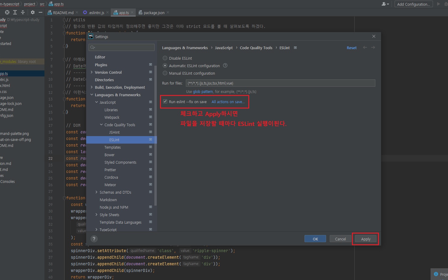 ESLint를 쓰는 이유로 코드의 자동완성이라던가 자동으로 코드의 formatting을 정리해주는 부분도 있다.