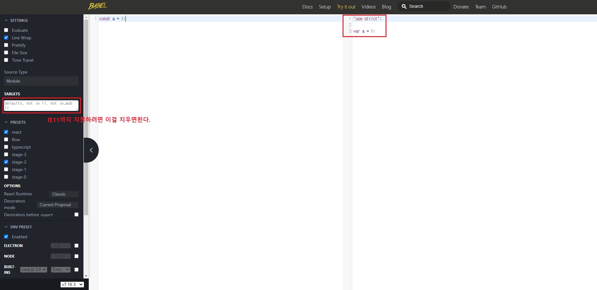 targets옵션에defaults, not ie 11, not ie_mob 11를 입력하면IE11은 제외하고 컴파일하고,