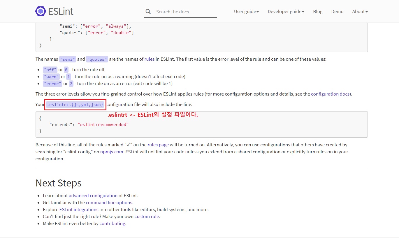 바로 다음 시간에 ESLint 설정 파일에 대해 살펴보도록 하겠다.