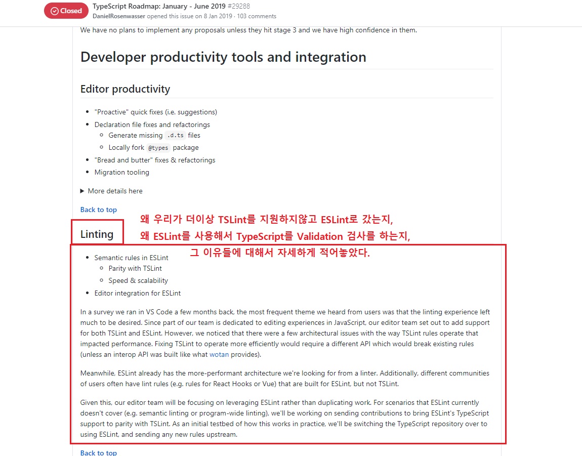 마이크로소프트 타입스크립트 팀에서 관리하는 TSLint라는 도구가 있는데, 그 도구보다 기존의 ESLint가 훨씬 더 좋은 퍼포먼스를 냈기 때문에