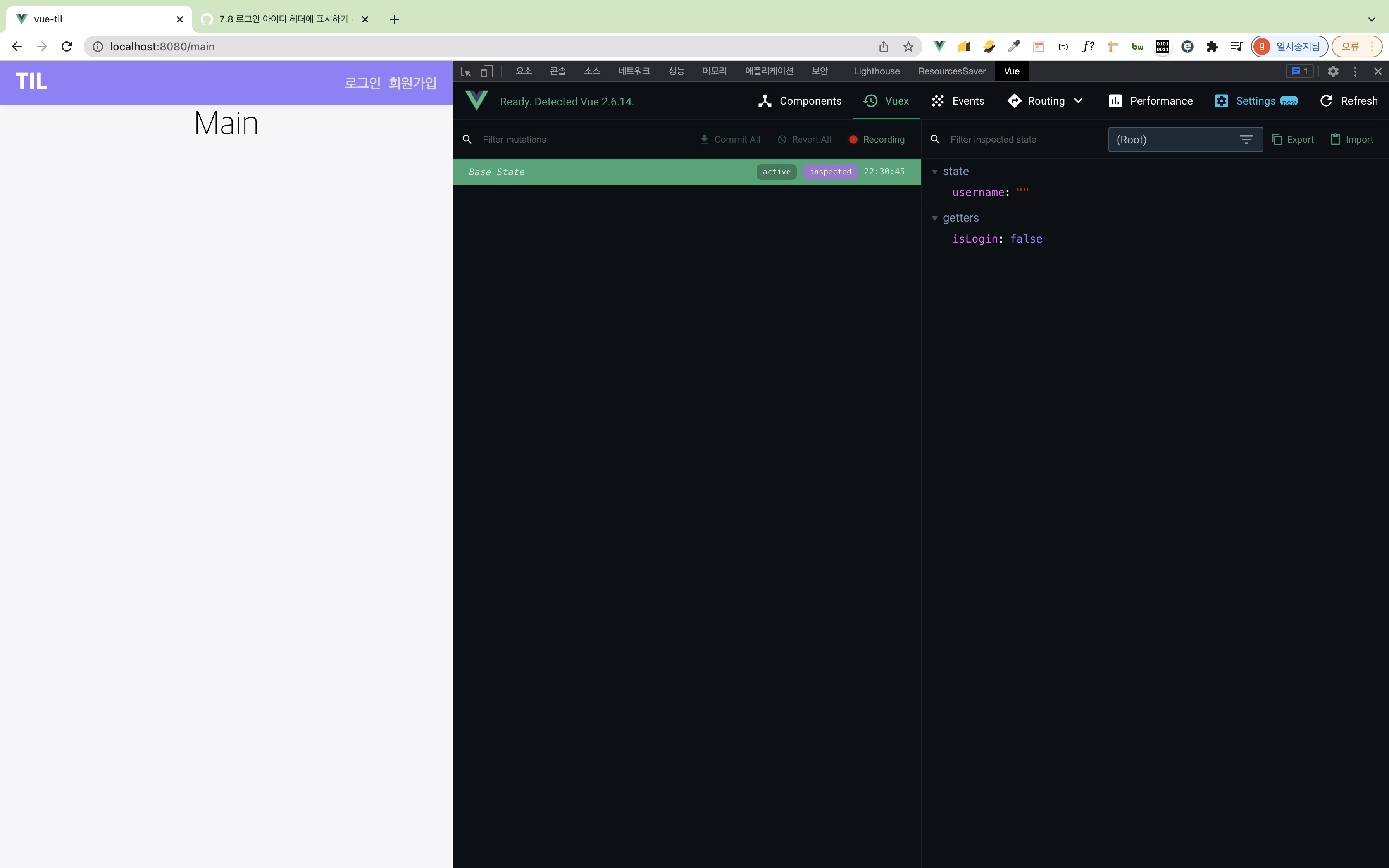 vuex를 설치하고 store를 설정하면 위와 같이 vuex 탭이 보입니다.