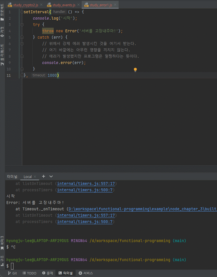 - 이미 아래와 같이 에러 객체를 넘겨주기 때문에 따로 처리하지 않아도 프로그램이 멈추지 않는다.