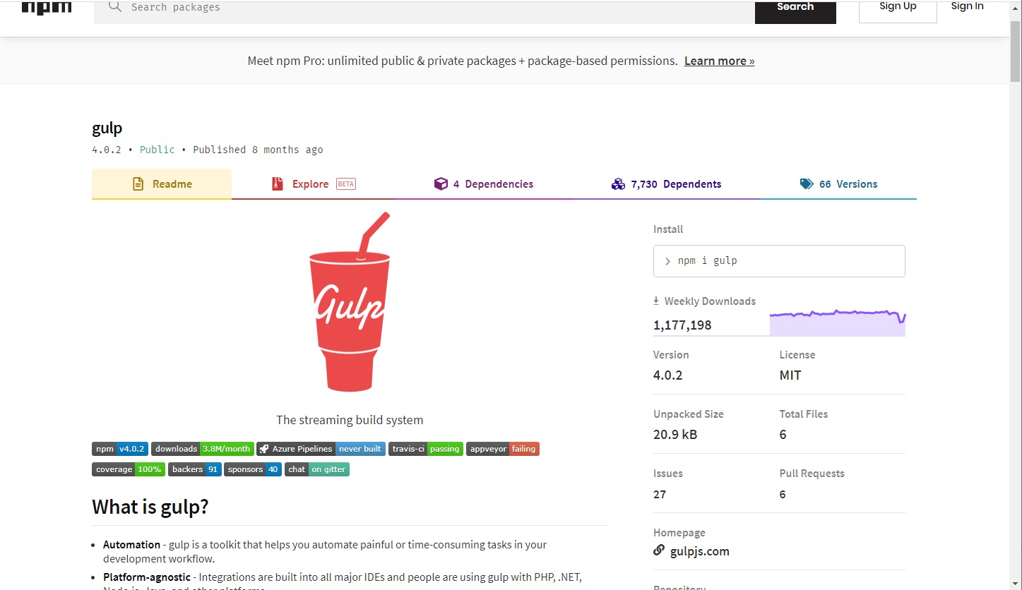 그중 다음 장에서 배울 Gulp는 사용자층이 많은 인기 패키지 모듈입니다.