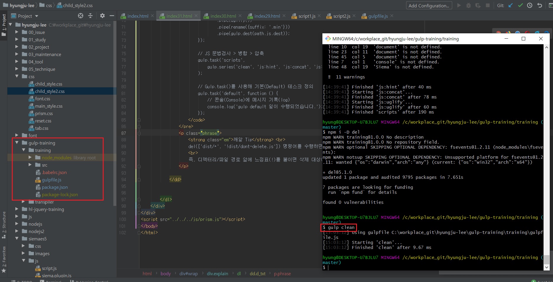 gulpfile.js 파일의 위쪽에서 del 모듈을 호출하고, 폴더 및 파일을 삭제하는 새로운 모듈을 정의합니다.