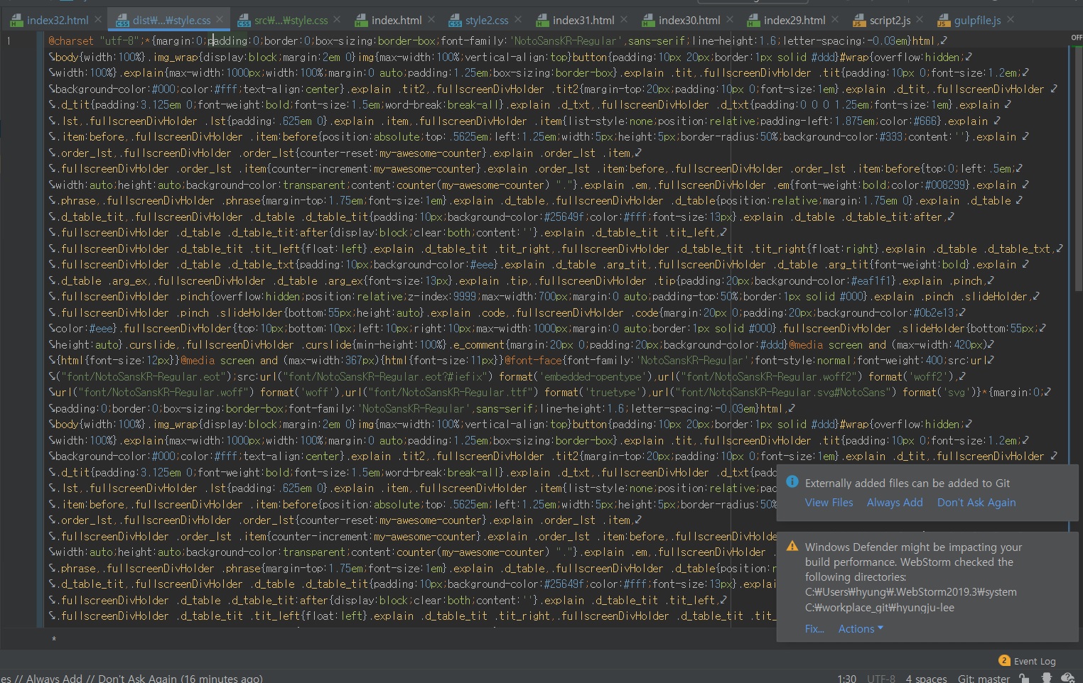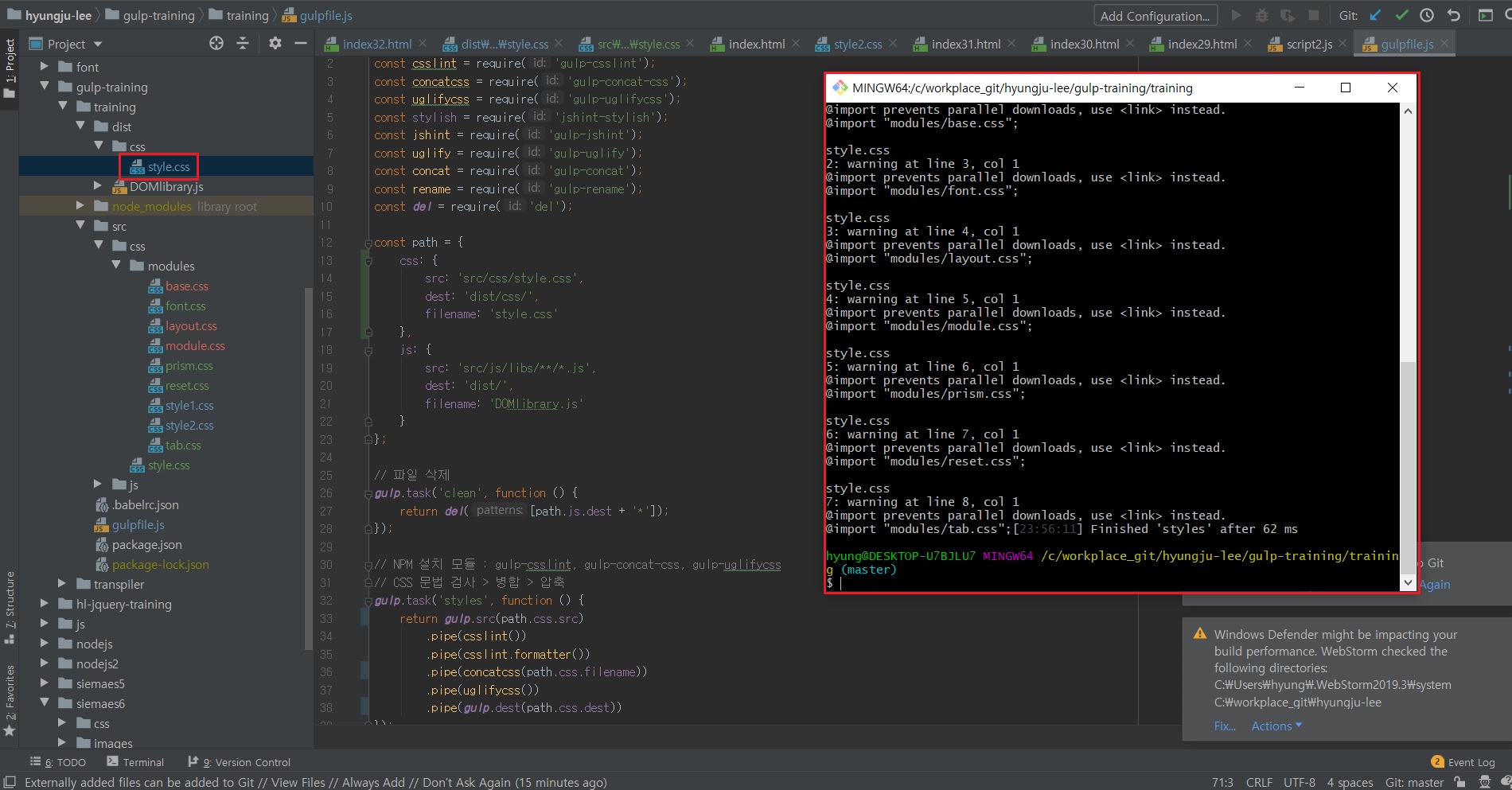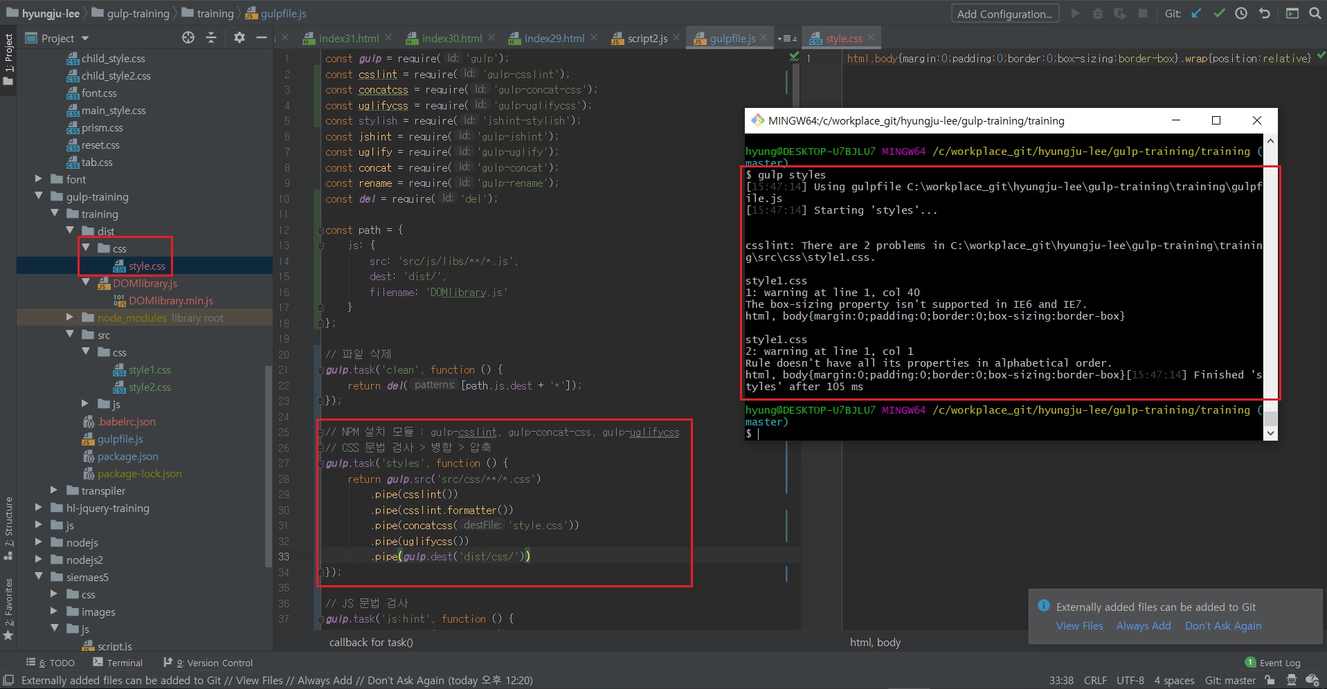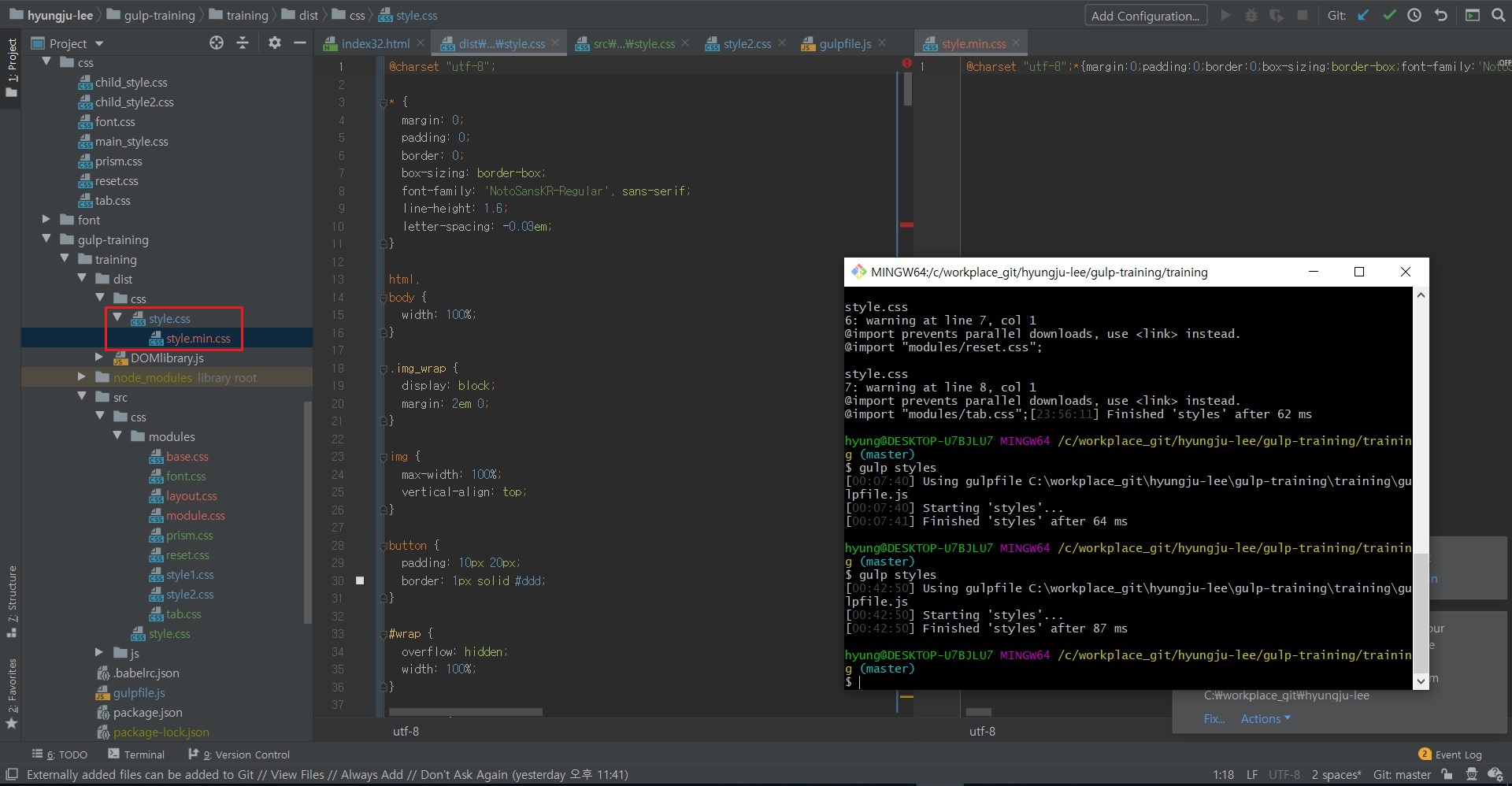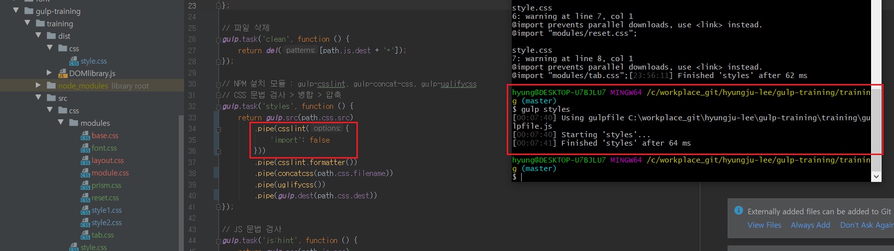 Git Bash에서 gulp styles 명령어를 실행하면 @import로 호출된 CSS 파일들의 병합이 진행되며,