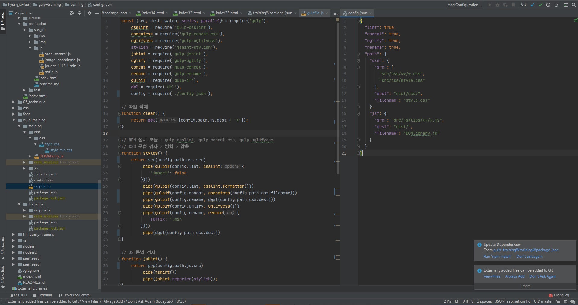 사용자 정의 환경 설정(Configuration)을 gulpfile.js에서 분리하여 별도로 관리하는 방법을 알아봅니다.