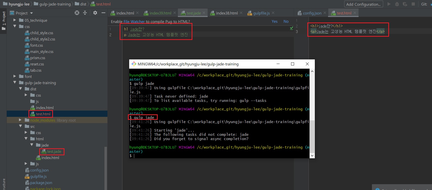 gulpfile.js 파일을 열고, 위쪽에 gulp-jade 모듈을 호출하는 코드를 입력합니다.
