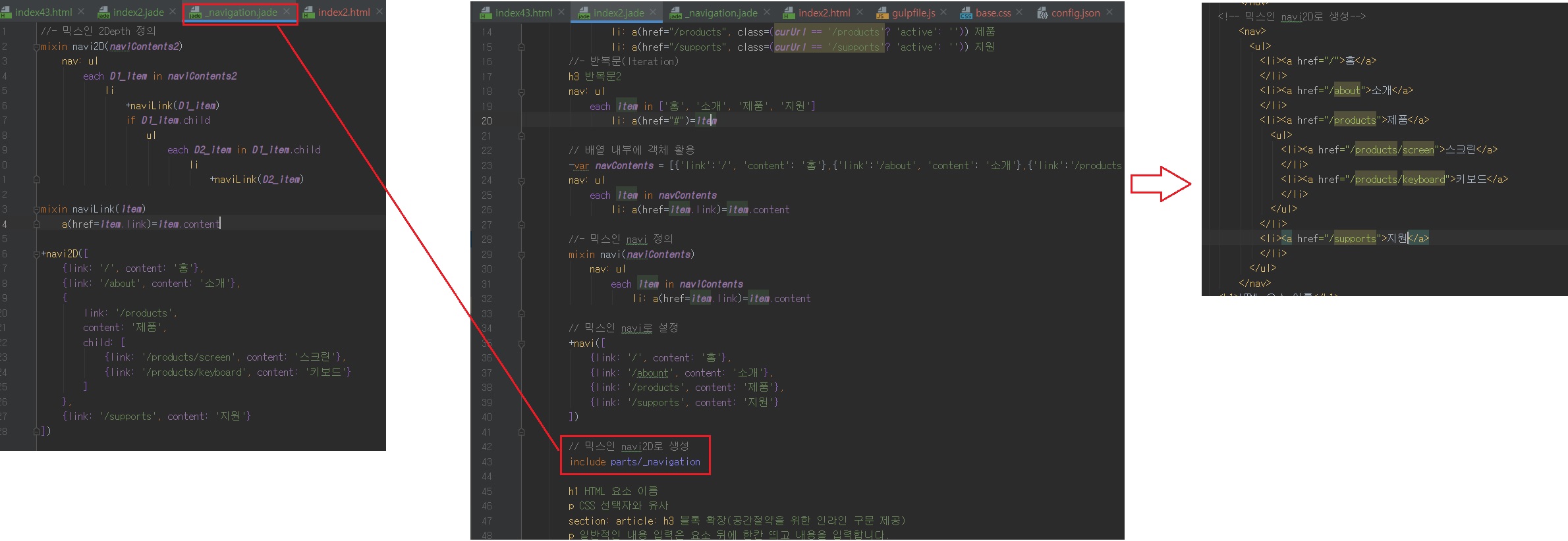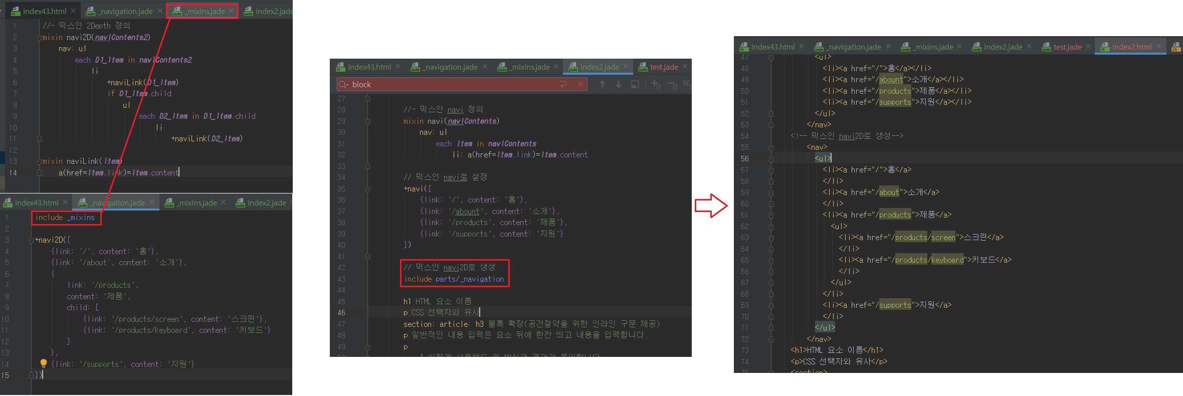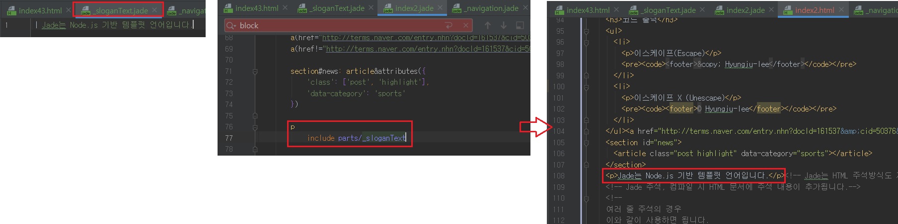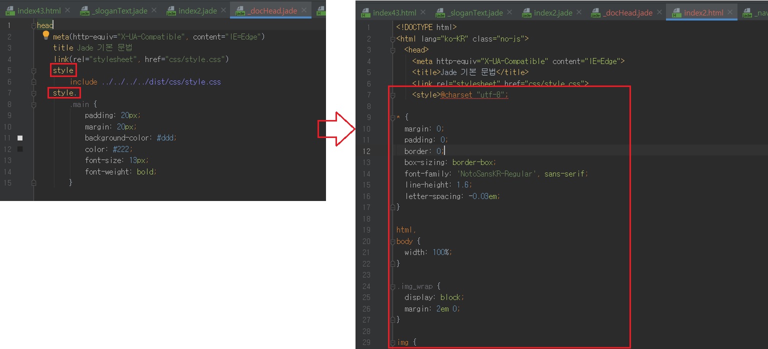 이처럼 index.jade 파일의 일부분을 분리한 후 parts/docHead.jade 파일에 저장하고 include 명령어를 실행하면 분리된 내용까지 포함된 결과물이 생성됩니다.