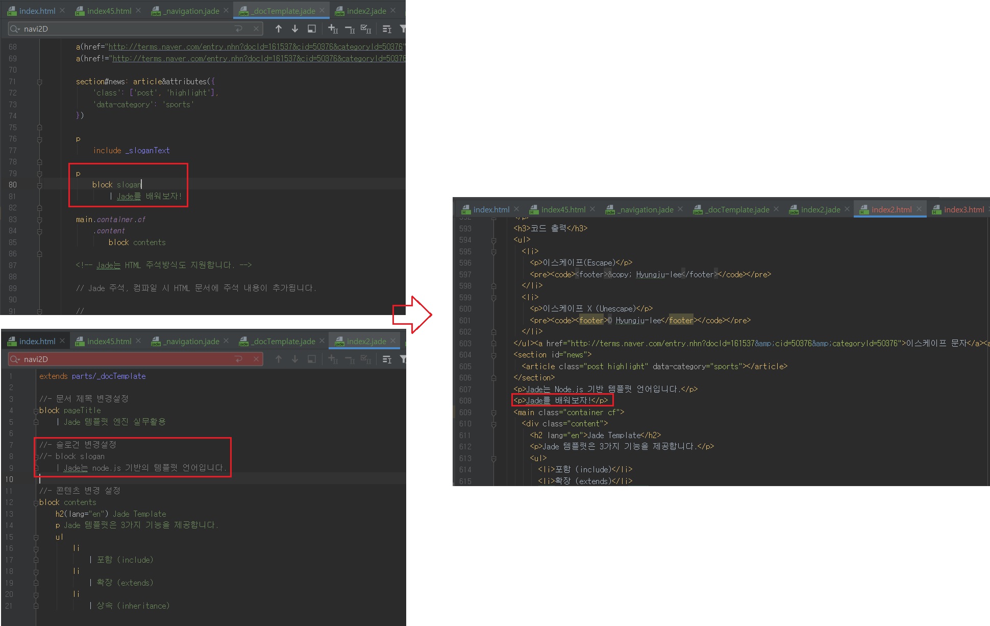 그리고 index2.jade 파일의 변수 block을 주석 처리하여 저장합니다.