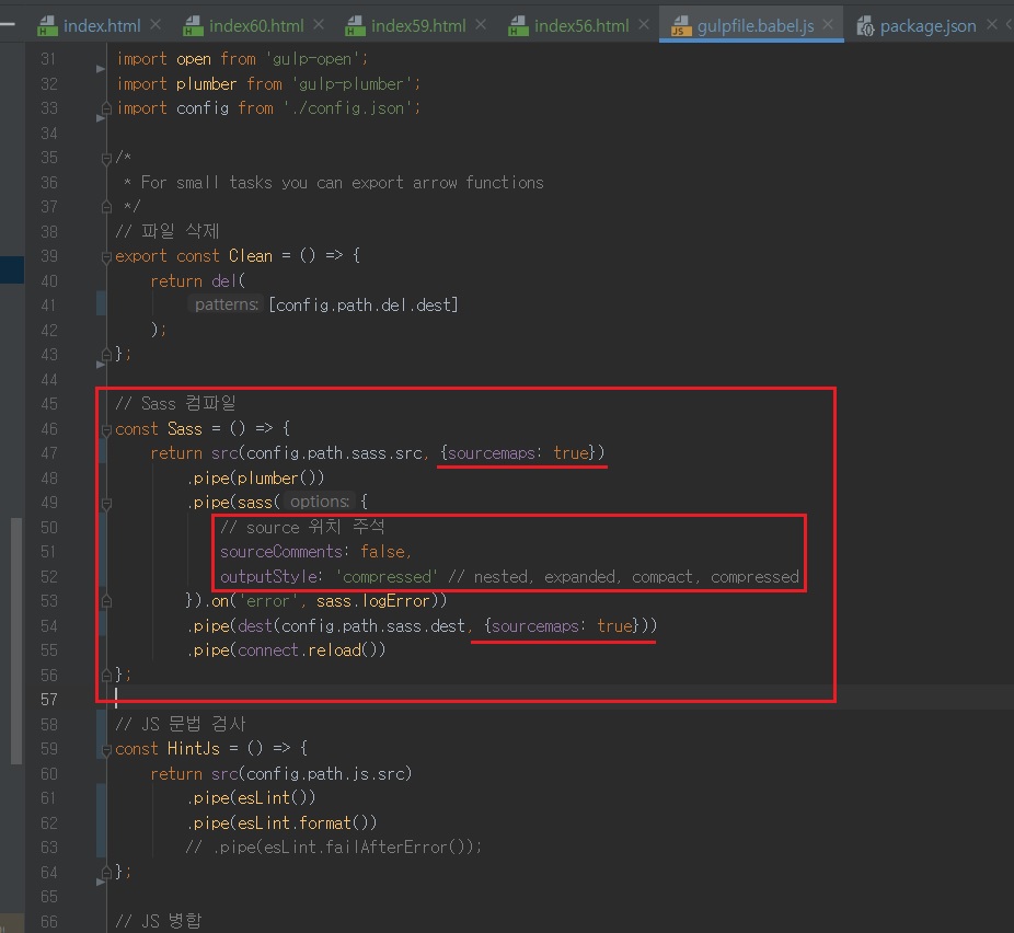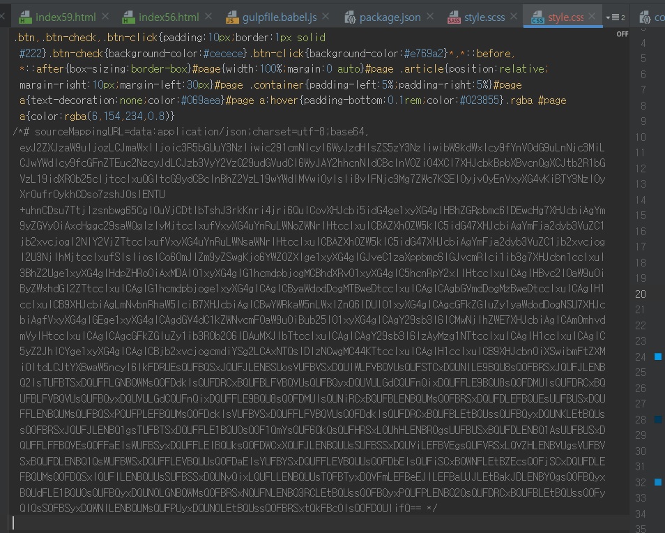 위처럼 소스를 작성하면 알아서 압축해주고, 알아서 해당 소스들이 어떤 파일에서 왔는지를 보여줍니다. (sourcemaps 기능 - gulp 4.0 부턴 내장되어있는 모듈임)