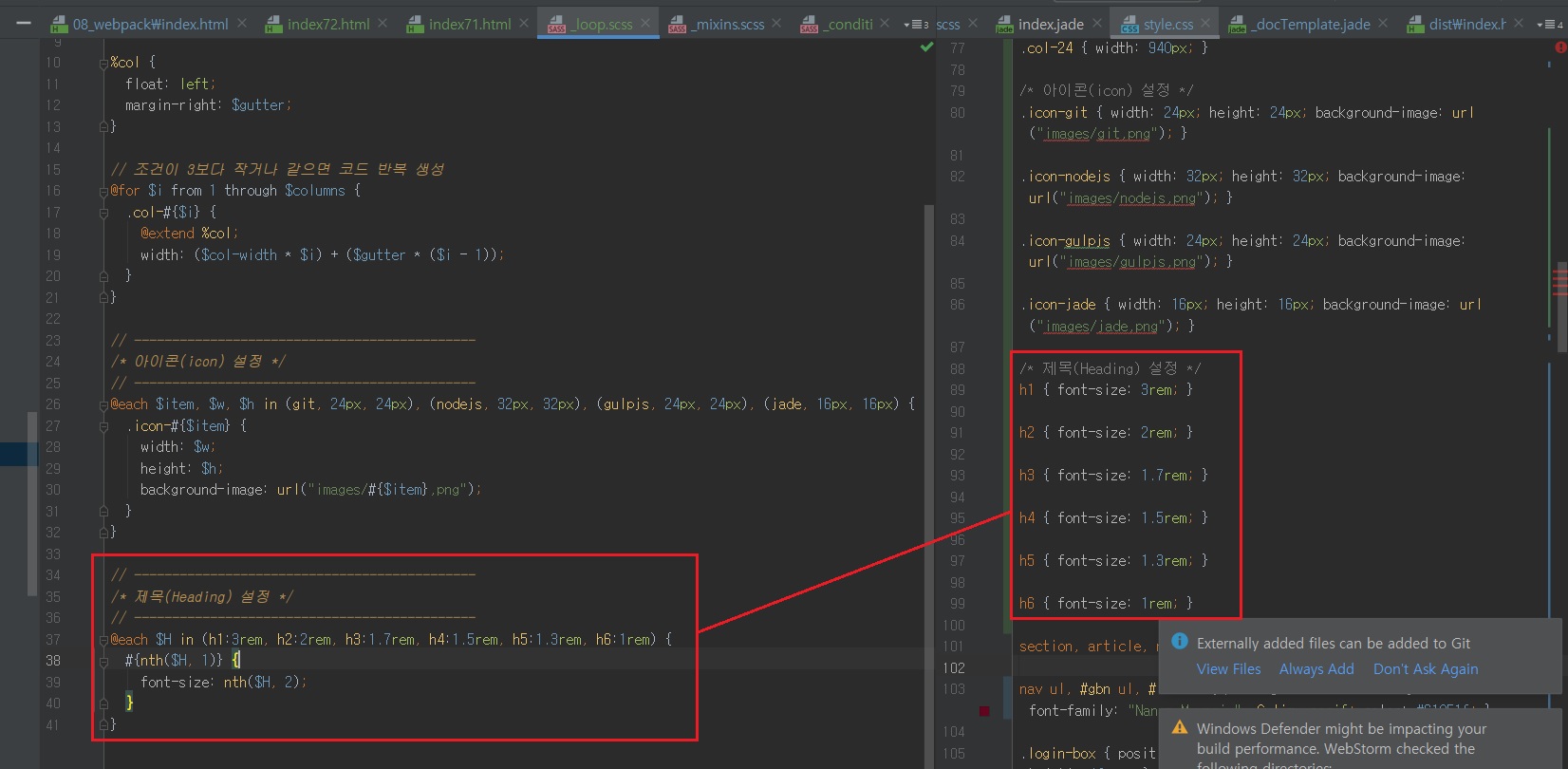 예를 들어, 순환 변수 $H가 h1:3rem 데이터를 참조할 때 nth($H, 1)을 입력하면 h1 원소를 꺼내 옵니다.