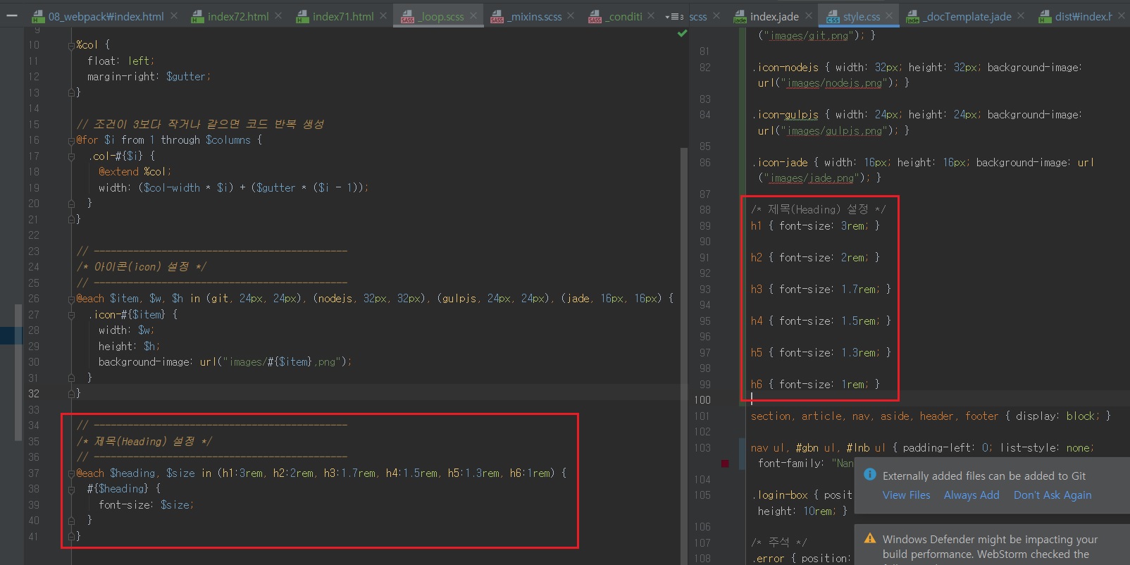이렇게 꺼낸 원소를 다음처럼 @each 구문의 스타일 선언문에 변수처럼 사용하면 됩니다.